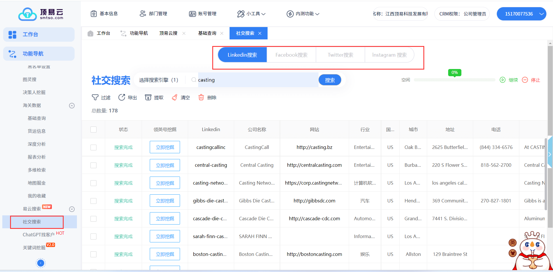 顶易集合4大社交平台,linkeidn,facebook,Twitter,ins等,通过产品关键词,一键获取社交平台主页的联系方式,邮箱,电话等。
