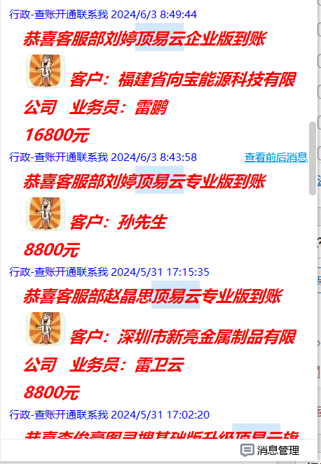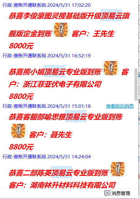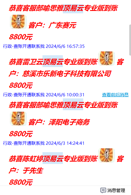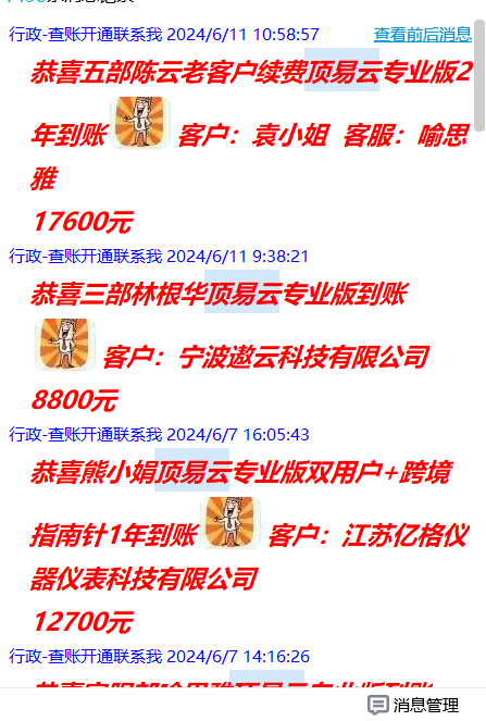 大家看到近期618的活动,我们顶易云的部门到账情况,已经有这么多的同仁了解,并认可,最后确认购买的,大家都是希望能多渠道开发国外客户的,所以大家都愿意尝试新的开发客户的渠道和功能。
