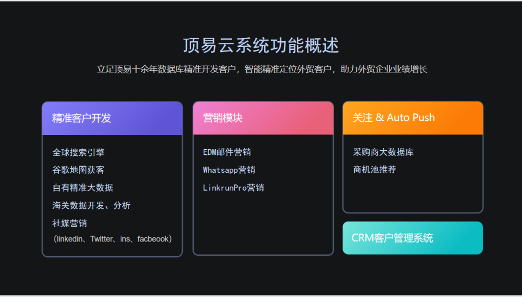 顶易软件致力于外贸客户开发行业已经11年的时间,服务近六万家外贸企业。有非常丰富的服务外贸企业开发客户的经验。可以专业解决大家开发客户的难题。顶易云软件是顶易公司今年最新推的版本,不绑定设备,不限制电脑,随时随地可以开发客户。