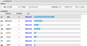我们以“sports watch”(运动手表)为例,通过海关数据系统按照产品查询,首先我们可以搜索到“sports watch”在各国的采购商数量,例如美国的采购商数量有22家,比排行第二的哥斯达黎加要多13家采购商,那么该产品的主要市场是在美国,如果我们确定做这款产品的话,那么需要着重开发美国市场。