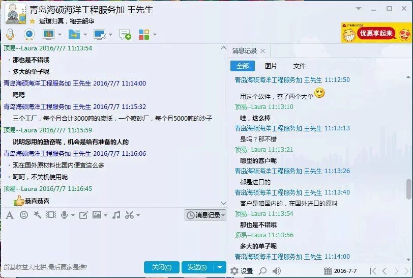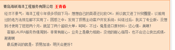 海硕海洋公司是做海洋工程服务,主营钻采平台建造与配套产品,在用过了多种开发客户方式之后,今年5月中旬选择了我们顶易软件,王经理平时比较忙,但是软件使用的很勤奋,调入搜索发送任务,经常是不关机使用,在短短的两个月就开发到了两个大单,跟我们客服反馈的时候喜悦心情溢于言表,这就是主动出击的优势,快速与同行前面找到优质买家,顶级易用的软件,搭配专业的售后服务团队等于优质的买家订单。