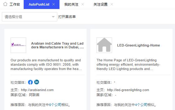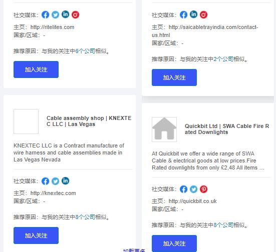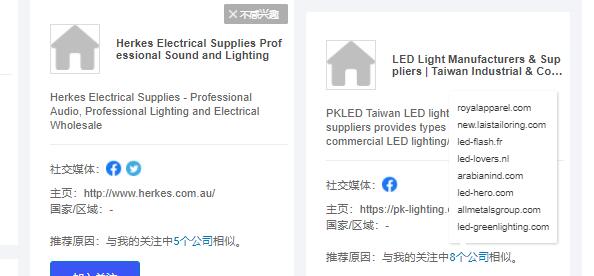 通过我们精密的算法,分析您已关注的客户网站类型、产品、网站结构,再到全球搜索引擎和我们的大数据库中进行匹配,推荐更多类似的客户给您。如果您觉得大数据推送的客户对口,可将推送的客户再次点击“加入关注”,系统会加强此类客户的推送。