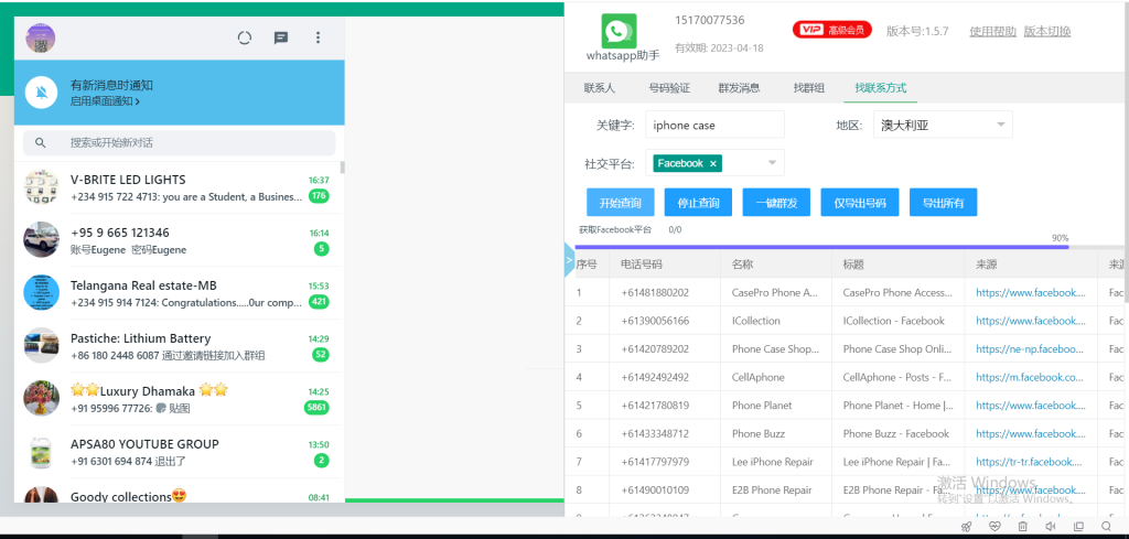 | Whatsapp群发 | 针对联系方式搜索,群组搜索获取到的电话号码可以进行一键式群发,最终获得客户的高效回复。 | |