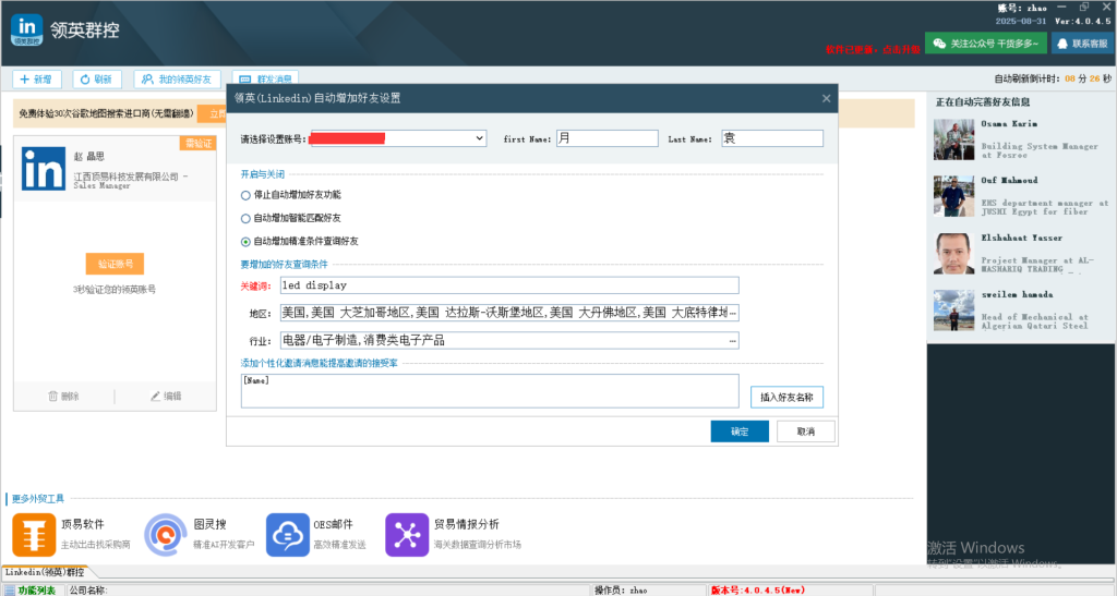 领英营销工具,模拟人工手工添加人脉。自动下载好友联系方式。批量好友信息群发