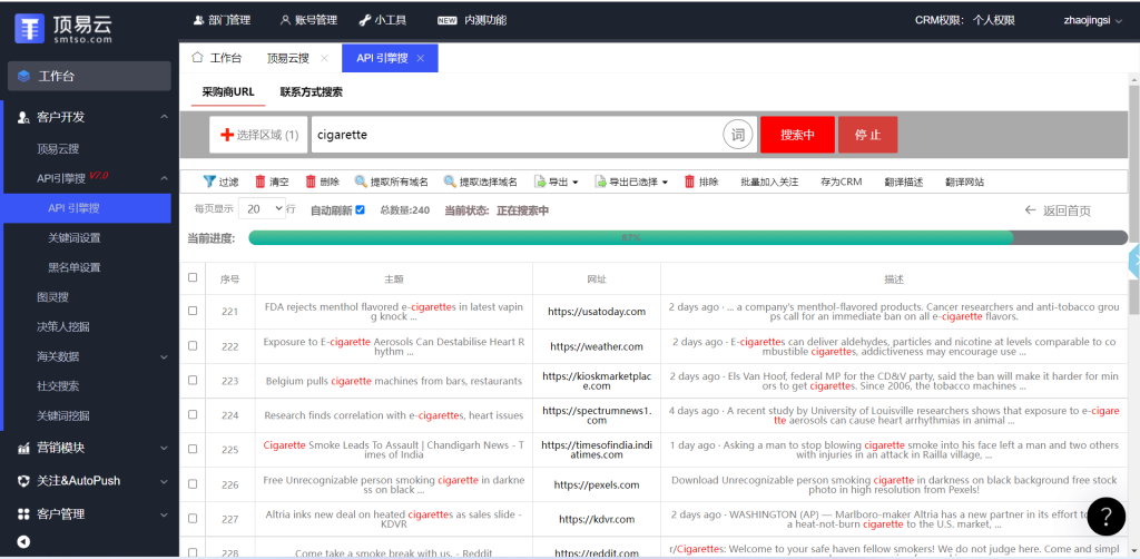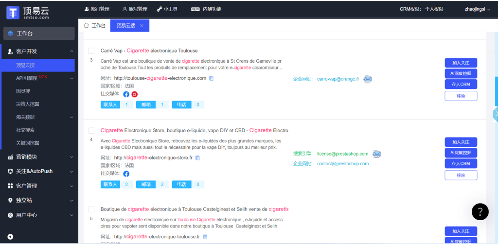 顶易云搜,是我们专门为外贸企业定制的一款搜索引擎,是一个高级采购商搜索功能,可以帮您搜索电子烟行业的高精准采购商