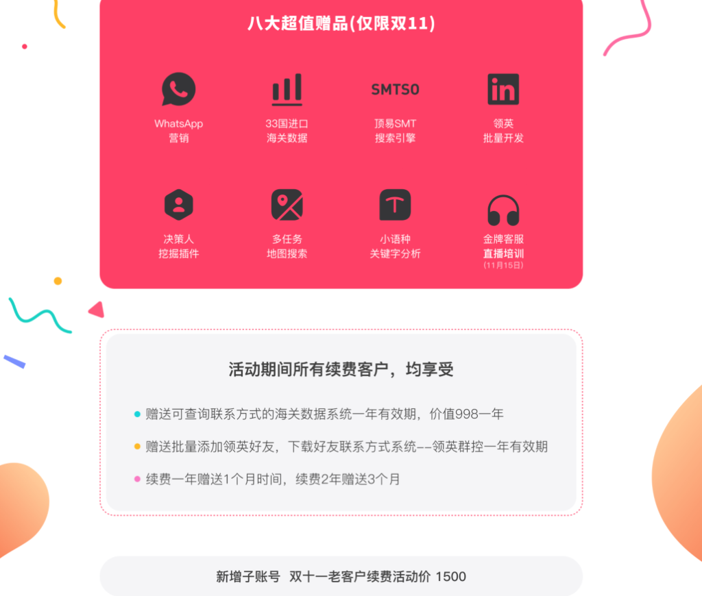 顶易双11,让您以全年最低价,获得最全面的外贸客户开发方案∶全网搜索引擎+谷歌地图+社交媒体+顶易自营精准大数据+海关数据+EDM邮件营销+WhatsApp营销