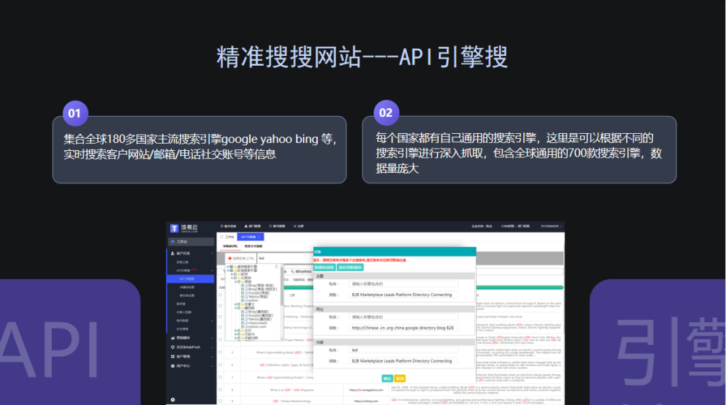 API引擎搜:整合全球180多个国家,上千款主流搜索引擎。搜索引擎作为全球最大的数据库,80%有网站的客户均会被收录,只要您的客户有网站,基本都会被API引擎搜开发到。
