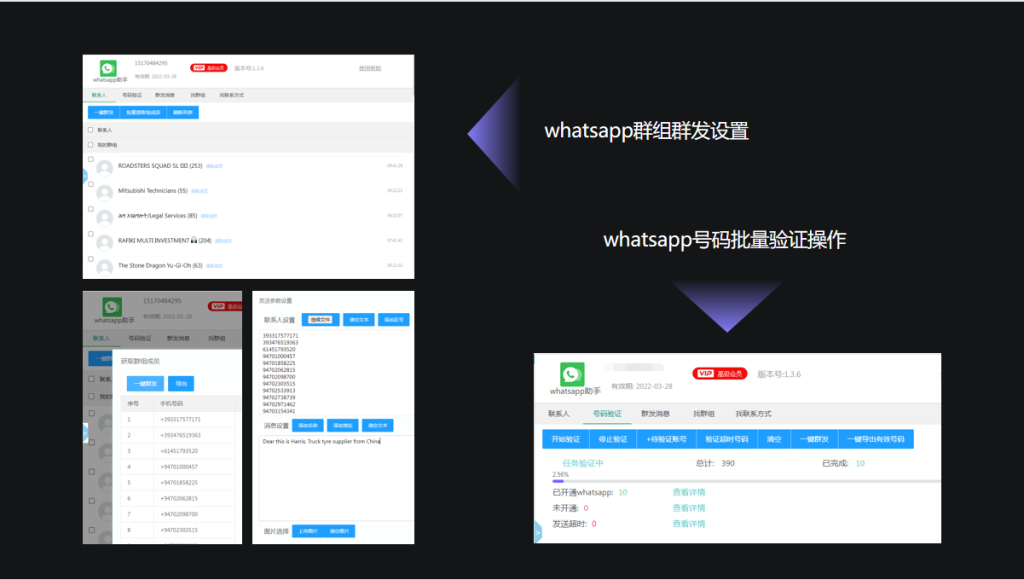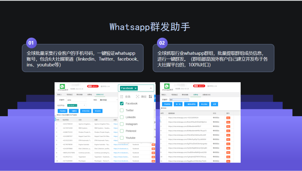 whatsapp群发:可以通过关键词,获取facebook,linkedin,twitter,ins,youtube,pinterest六大社交平台的电话号码信息,无需添加好友,可以一键群发,快速营销。还可以获取群组连接,自动入群,提取群组成员信息