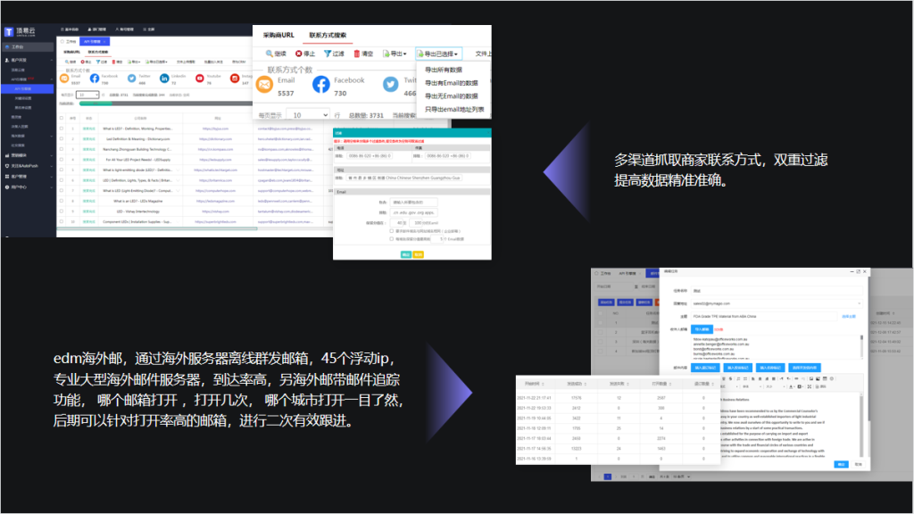 所有数据实时更新,从搜索引擎、客户官网抓取下来的最新信息,包括邮箱、Facebook、推特、领英、YouTube、Instagram、Pinterest七大维度,无论您是邮件营销,还是社交媒体营销都将不再缺少客户资源!让您走在行业的最前面!