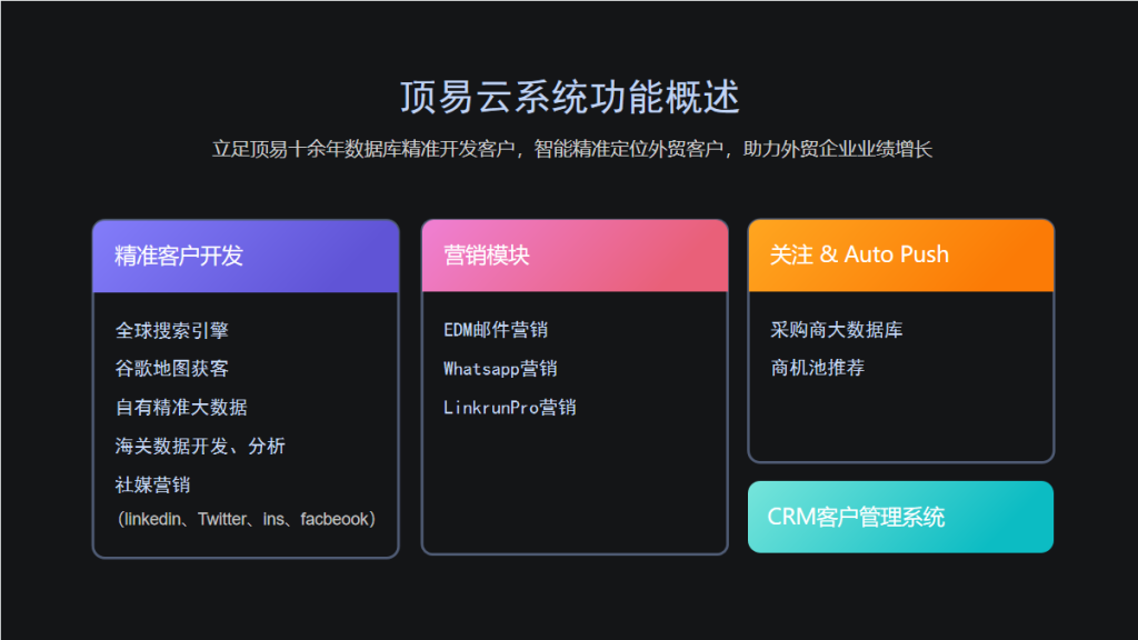 顶易云客户开发系统,可以满足您多渠道,多途径开发全球订单
