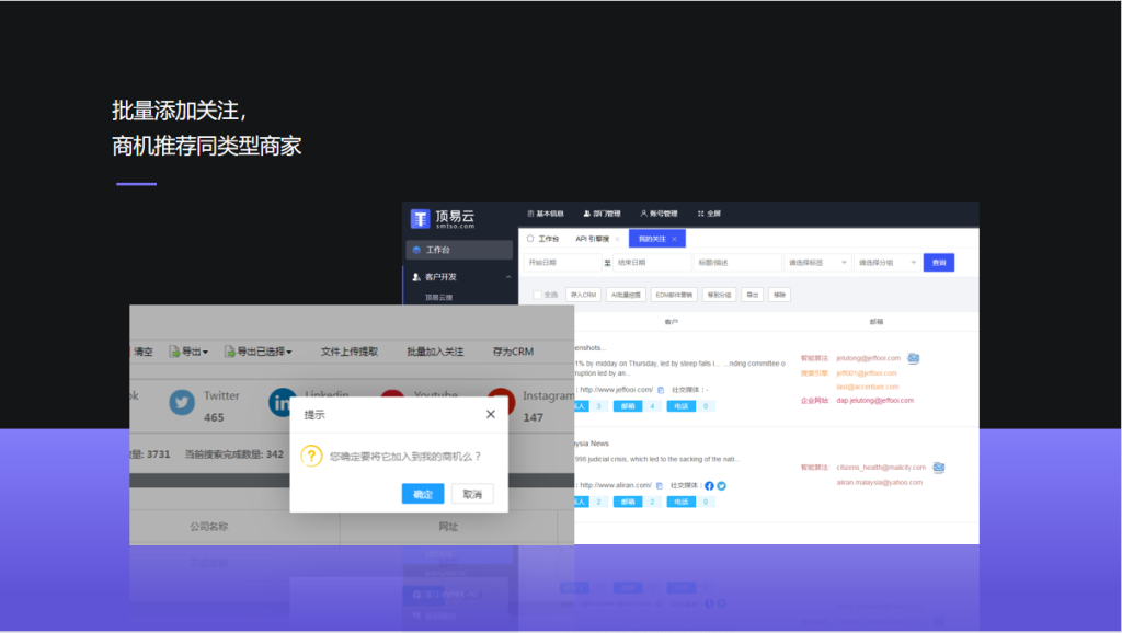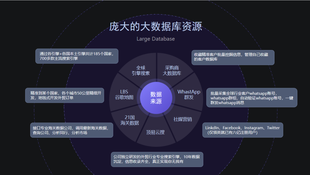 顶易云搜、商机池推荐、api引擎搜、图灵搜谷歌地图搜、决策人挖掘、海关数据、易查查挖掘系统、海关数据查询、社交媒体账号搜索、whatsapp营销、linkedin营销、邮件营销、facebook客户监控、手机版搜索、独立站商城