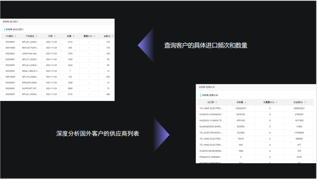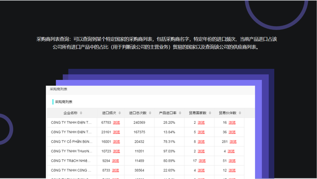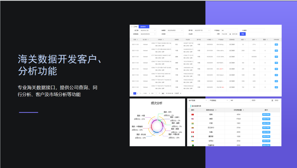 海关数据:可以根据产品的表述,海关编码查询33国进出口数据,能看到同行跟采购商的交易明细,还可以看到同行和采购商合作的上下游企业,重要的是可以挖掘采购商的联系方式。