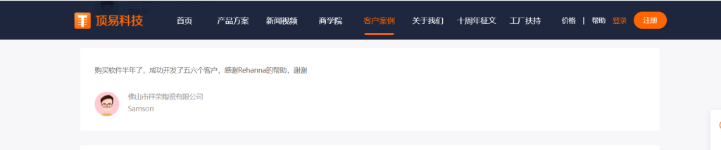 佛山翔荣陶瓷制品有限公司,使用软件已经十年的时间了,一直用软件效果非常好,每年都会开发到稳定的订单。有稳定的客户跟进的。