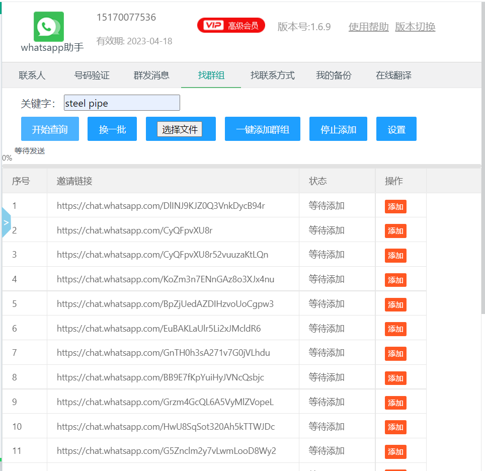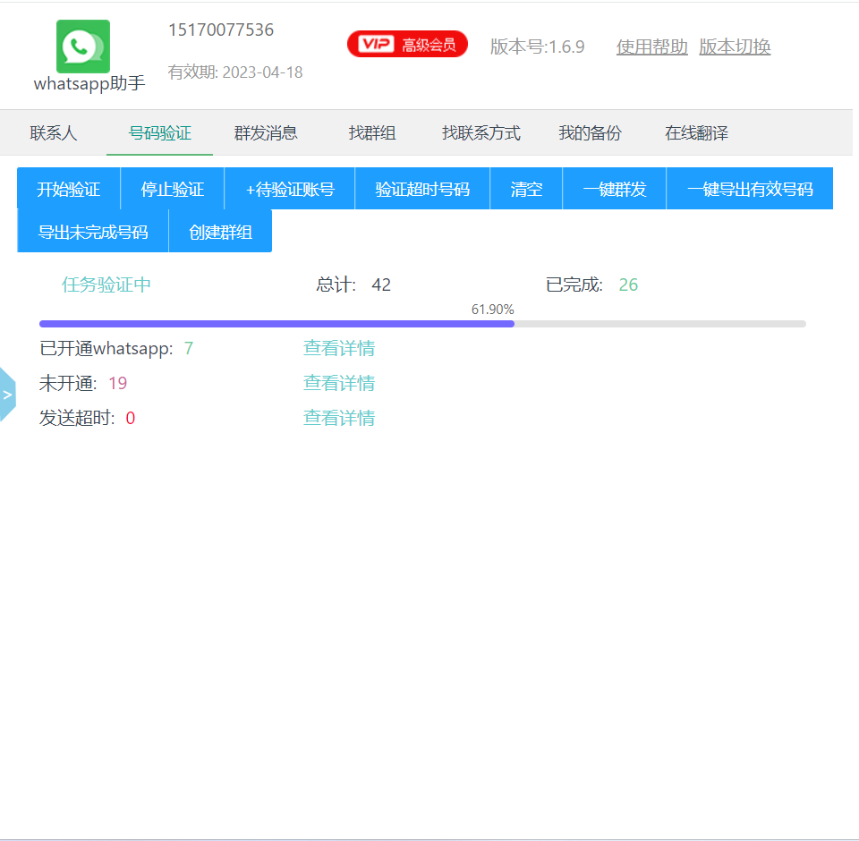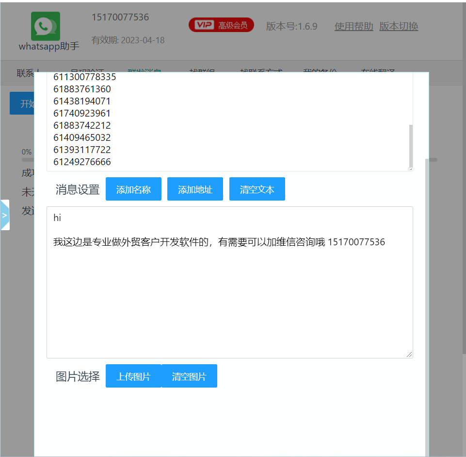 一键群发:无需添加好友,可以一键给所有的电话号码群发消息,快速,高效的跟国外客户直接联系,查看客户实时状态。