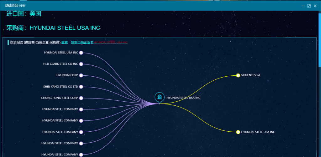 可以按照公司名称查询,比如我们想要知道同行合作的客户有哪些,直接输入同行的公司名称,那同行合作的客户就全部展示出来了。同样,如果我们想查看我们合作的采购商是不是忠诚客户,输入采购商的公司名称,我们能看到采购商合作的供应商有哪些。