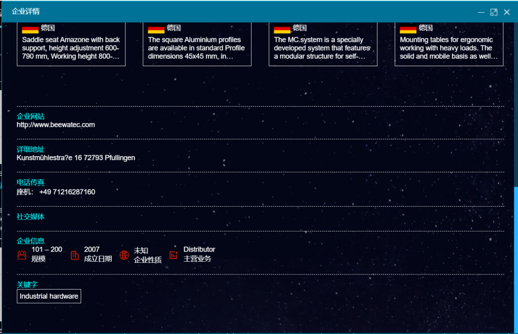 输入关键词、海关编码能清楚的看到采购商的具体地理位置,能看到采购商的联系方式,邮箱,电话,社交媒体账号,还能看到企业的背调信息。