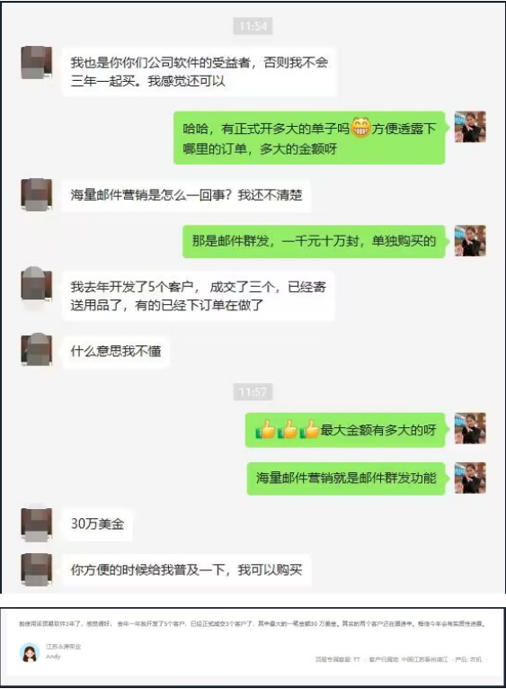 江苏做农机产品的客户,使用软件反馈最大接单30万美金,使用社媒开发见效很快、