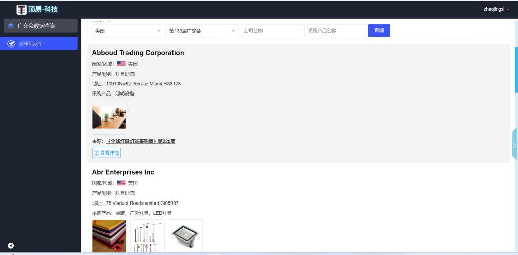 接下来咱看下,顶易广交会参展商查询系统,能看到参展商的什么信息。我查询一个灯具行业的数据展示下。客户信息是由客户自己参会时提供,行业唯一保真数据,100%真实有效!!!可以看到买家地区,产品类别,采购需求,并且附带电子书,详细标记来哪本期刊第几页