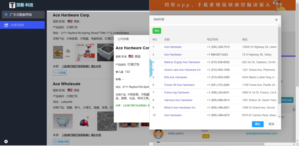 顶易公司一直致力于大数据拓客,可以多渠道,多途径联系全球的采购商,那顶易不会放过广交会这么炙手可热的数据的,并且是行业内唯一保真的采购商数据。即使您没有参加广交会也没关系,您也是能直接联系到参展商的哦,跟您参展没啥区别的呢。