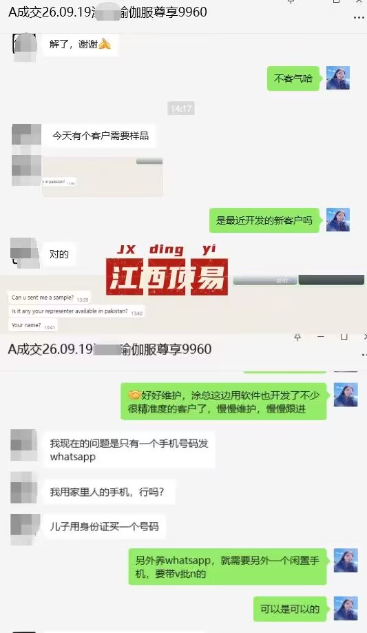 客户1:续费三年的老客户,做瑜伽服出口,每个月都有新订单,今天又来反馈,通过whatsapp开发到了巴基斯坦一个样品单
