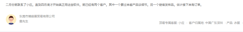 客户2月份的时候了解软件,4月份真正开始使用,到现在就有2个意向的客户了,其中一个客户下了样品单。