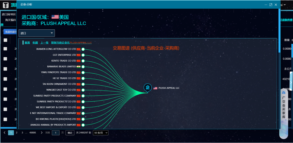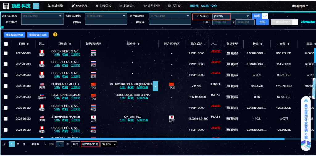 在顶易海关数据查询系统里面,产品描述输入 jewelry,共计查询出来249万多的采购商采购记录!