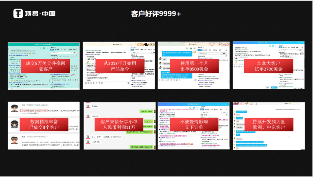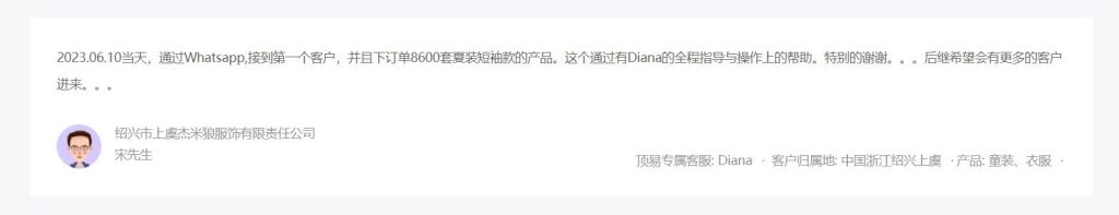 客户反馈:使用顶易云2个软件,利用whatsapp开发到印尼的客户,第一次下单8600套,第二次下单13款,每款1500套,第三次下单4000套,顶易云软件效果确实好,目前收到货款63万。