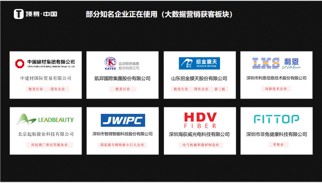 顶易云软件拥有丰富的资源库和全球化大数据库,可以帮助我们快速锁定目标市场,并找到潜在客户,无论是哪个行业、哪个国家,只需简单几步操作,就能获得海量高质量客户资源,同时软件还提供了智能筛选和分类功能,根据我们设定的条件进行精准匹配,在庞大的客户群中迅速找到符合我们产品需求的目标客户变得非常简单,节省了大量时间和精力!
