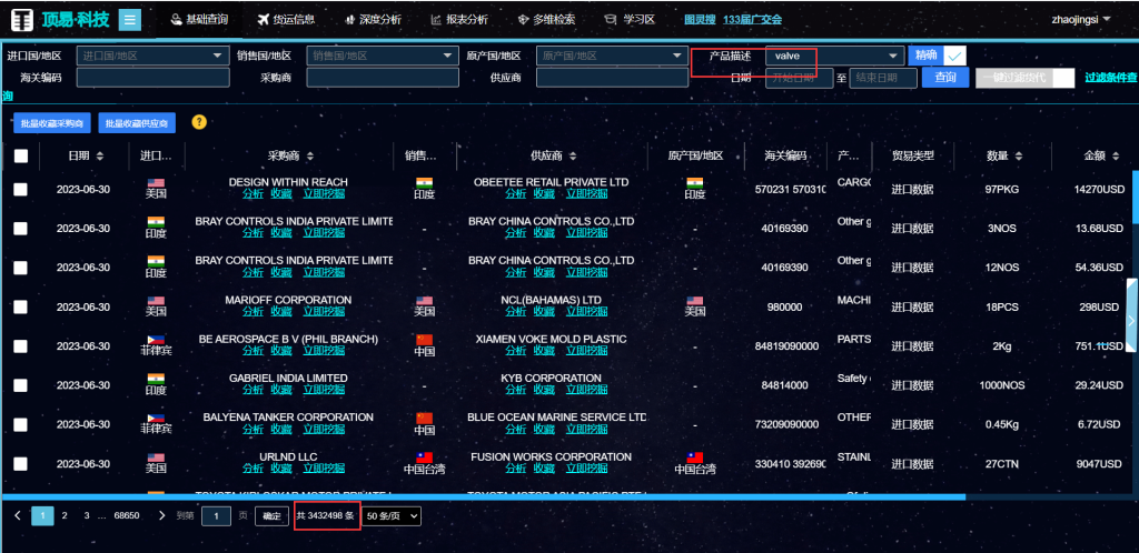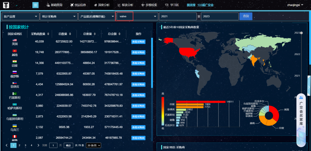 打开一下顶易海关数据查询系统,我们可以在深度分析里面查看产品在全球的销量排名,能帮助我们有效的洞察市场行情。阀门行业为例。