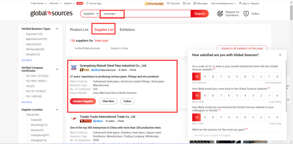 第一步:我们打开环球资源官网,在磁条框输入您的想要查询的行业或者产品,我以steel pipe为例,查询出来供应商的列表。