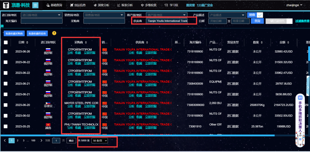 第二步:我们在顶易海关数据查询系统里面,输入供应商的公司名称,直接查询采购商。