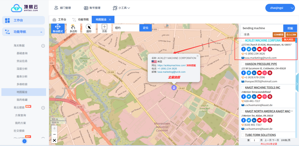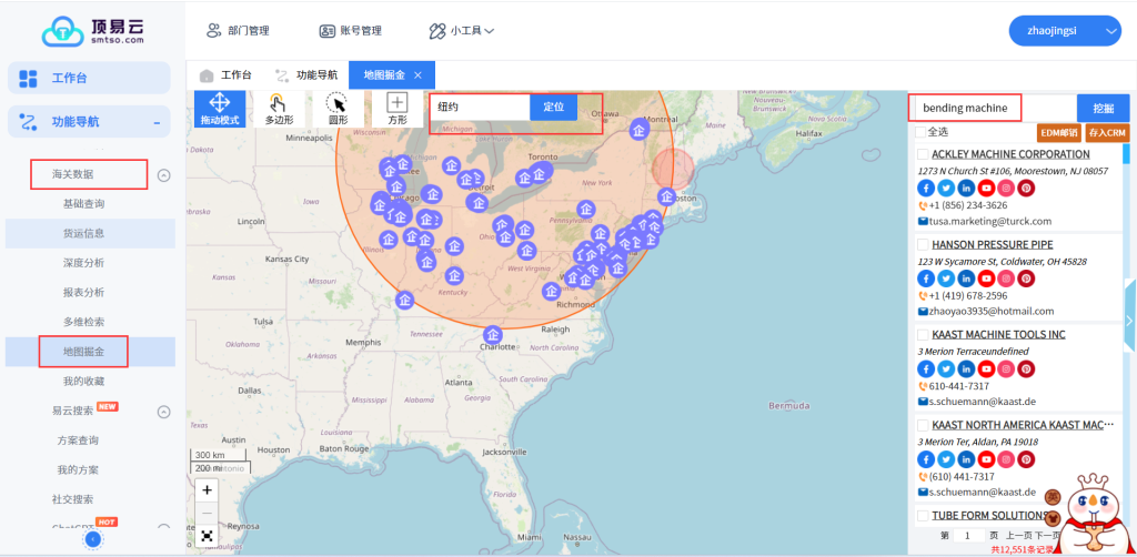 顶易海关数据查询系统,还有一个非常强大的功能,地图掘金,直接在谷歌地图上面查找海关数据的采购商,可以按照国家,城市查询,我以纽约城市,折弯机产品为例。
