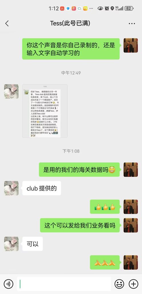 客户情况:这个客户是tess的会员,当时tess跟我们公司合作,推荐顶易海关数据给客户,这是其中一个会员出单的捷报。