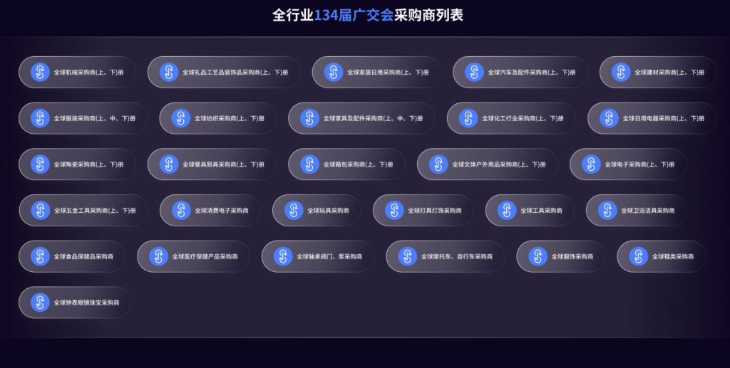 1,数据多且准:18w家最新134届广交会采购商名录,可以按照行业来搜索,也可以按照产品关键词来搜索。