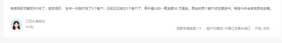 效果反馈:江苏永涛实业选择使用顶易云软件,是顶易软件的老客户,已经用了3年的时间了,去年使用顶易云开发到5个客户,成交了3个稳定的大客户,已经有30多万美金的订单了。