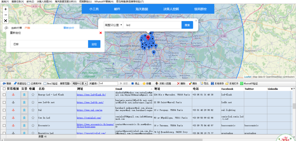开发巴黎客户首推工具,谷歌地图搜索,可以直接定位巴黎城市,输入关键词,就可以直接搜索到巴黎的客户,我们看下集体实例