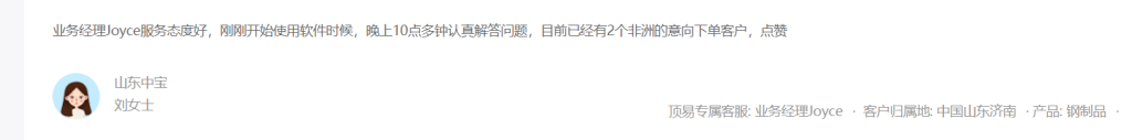 效果反馈:业务经理Joyce服务态度好,刚刚开始使用软件时候,晚上10点多钟认真解答问题,目前已经有2个非洲的意向下单客户,点赞