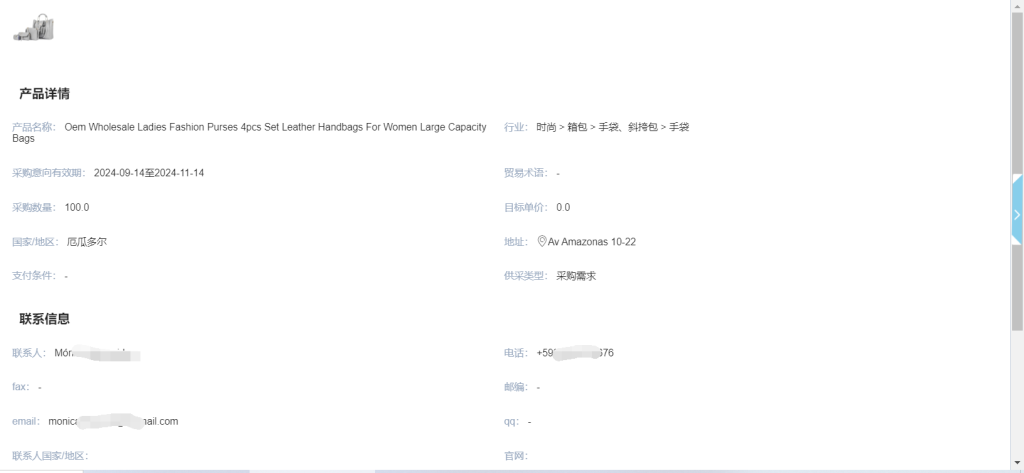 看看这个箱包行业的询盘,一个厄瓜多尔的客户,要采购手提袋,需要100个,有做箱包的外贸朋友,可以直接联系客户报价跟进。