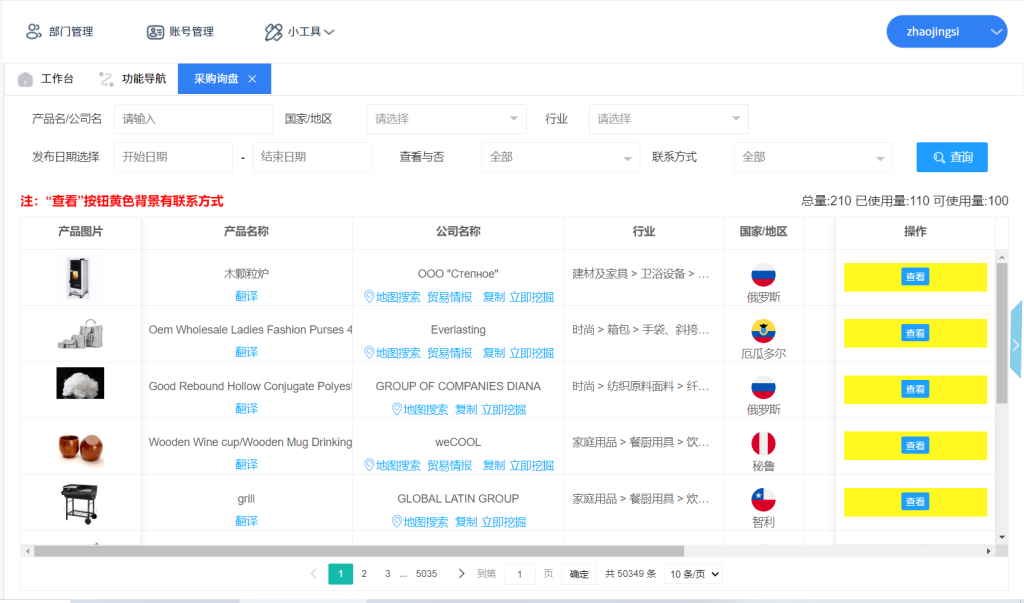 顶易云通过特殊算法,可以获取全球180多个国家本土采购平台,横跨56大行业的采购询盘,同步更新,可以直接查看采购商的具体采购信息,采购的单品,采购的数量,采购人的邮箱,电话,还有采购商公司信息,能第一时间联系到客户,给客户最有好的报价,获得合作机会,特别提醒快消品行业的客户,询盘更新很快,询盘量很大。