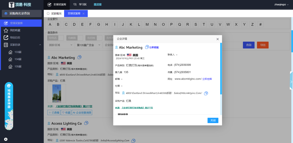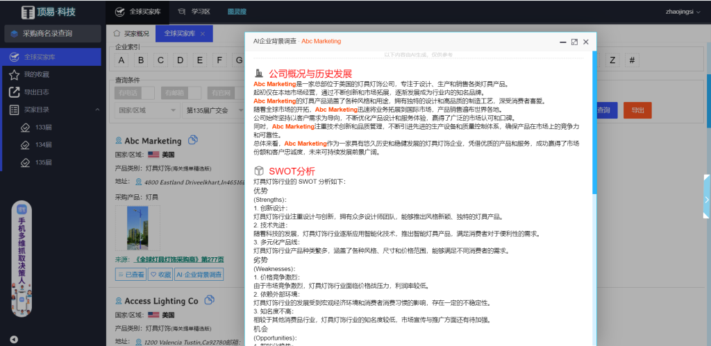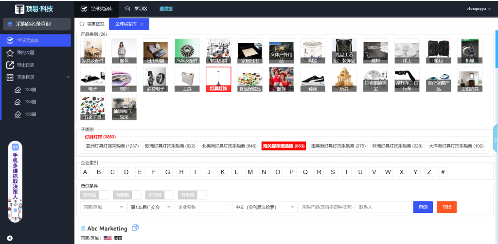 顶易有一个广交会查询系统,可以查询来中国参展的采购商信息,这个工具不仅可以查询28个行业的参展采购商联系方式,还可以结合海关数据做背景调查,这样就能更多的对采购商背调,更好的开发。