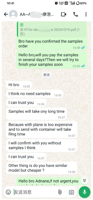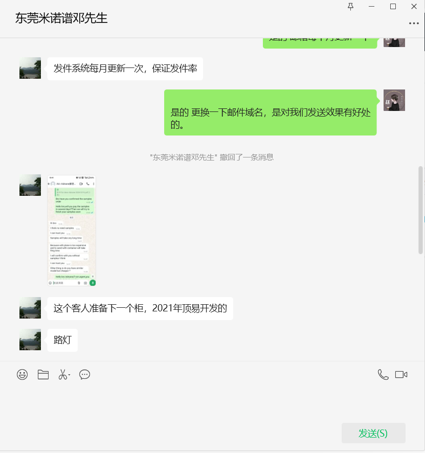 效果反馈:邓总是顶易多年的老客户,21年使用顶易软件开发到摩洛哥的客户,下了样品单,近期客户返单了一个柜!真的是很好的消息,给我们外贸伙伴一些鼓励,主动式营销的效果是非常不错的。