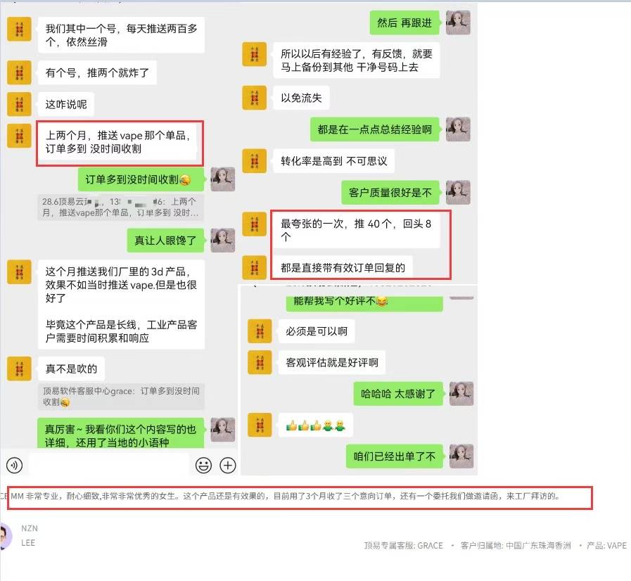 效果反馈:对于客服妹妹的服务非常认可,并且使用顶易云的系统三个月,开发到三个客户,并且有一个要看厂的客户。